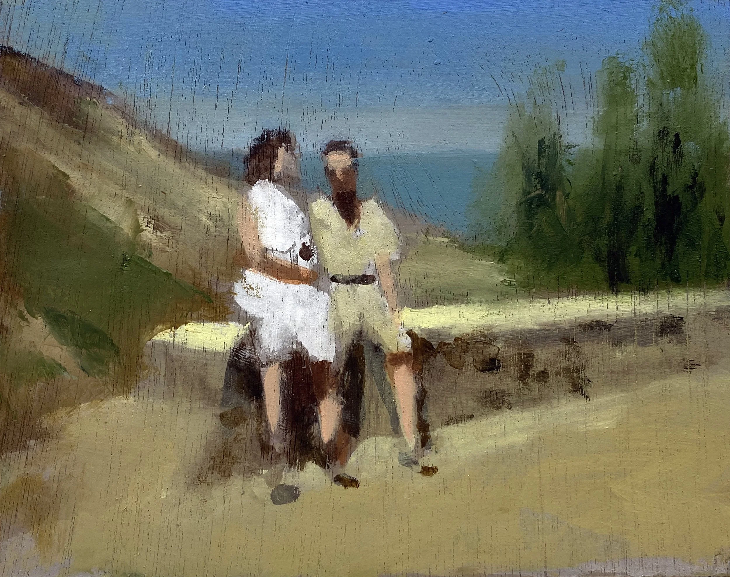 ‘Friends in the Surf’, egg tempera and oil on wood panel, 13 x 10 cm, (5 x 4 inch). Sold.